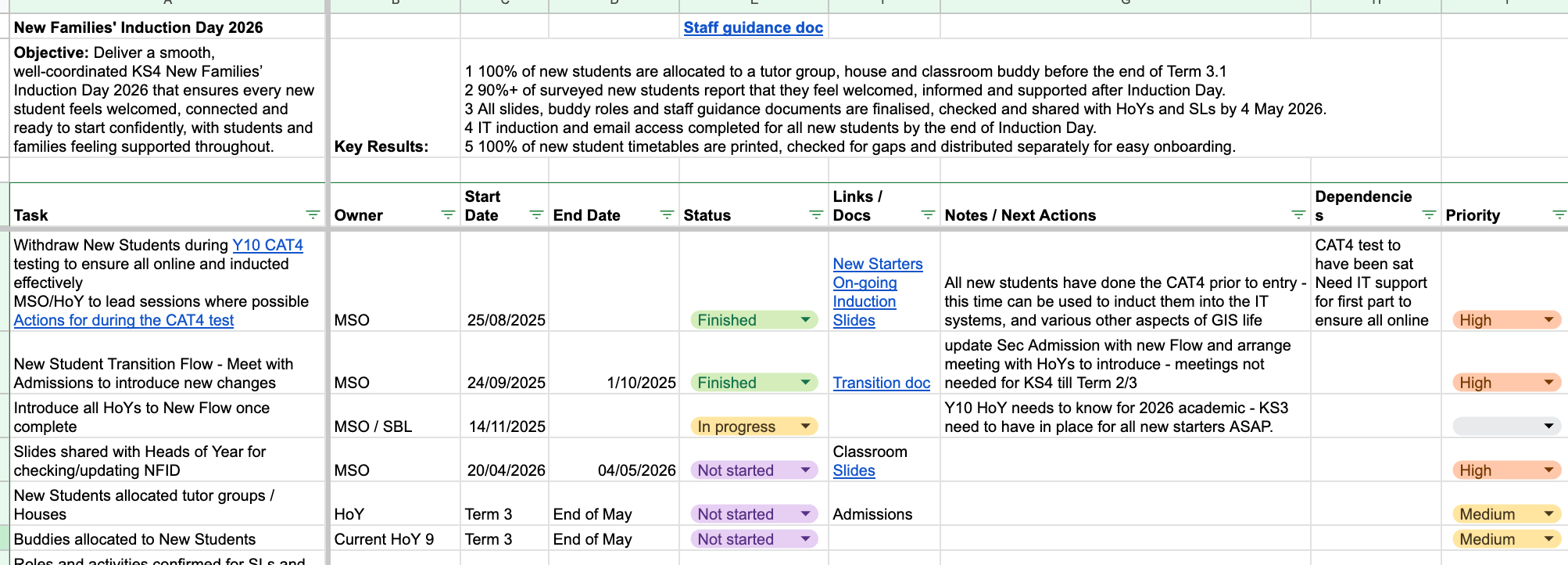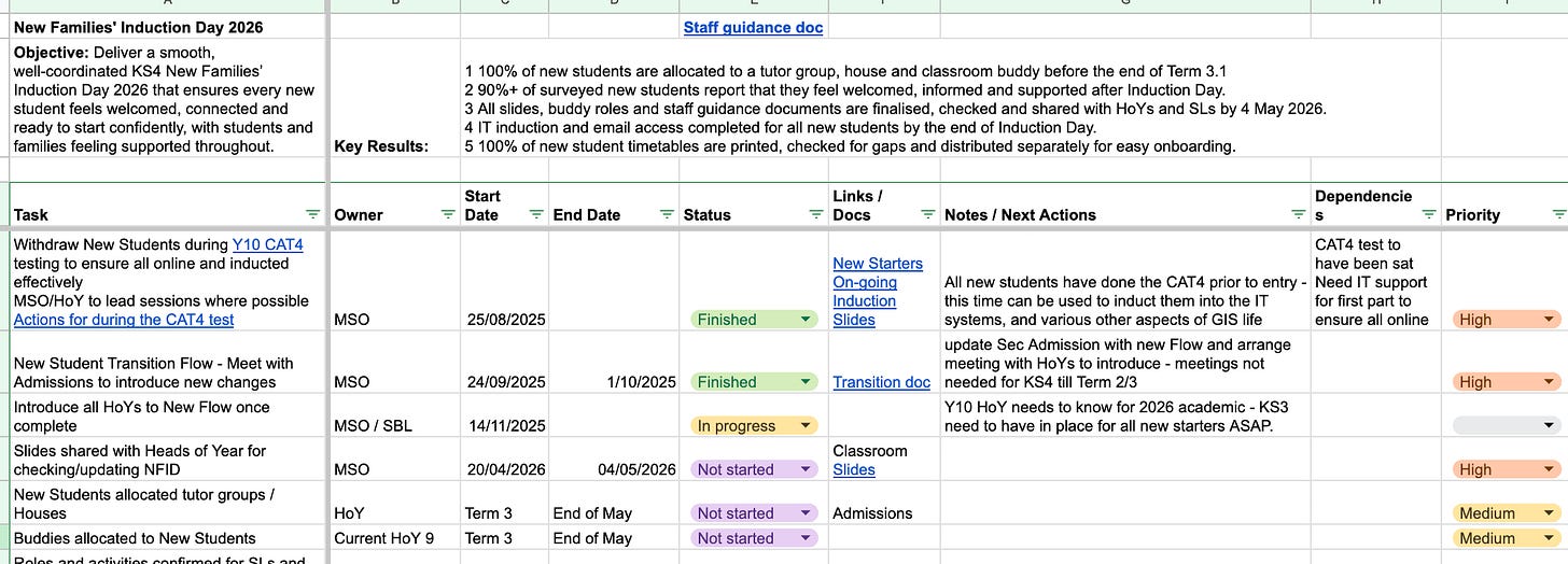 For every project, I keep one master sheet with a simple timeline and checklist. I work backwards from the delivery date, plotting the key steps and linking the documents, slides and forms I’ll need along the way. Each tab covers one project, with an overview tab that brings everything together in one view. It’s not fancy, but it works – and the more responsibilities I’ve taken on, the more I rely on it.