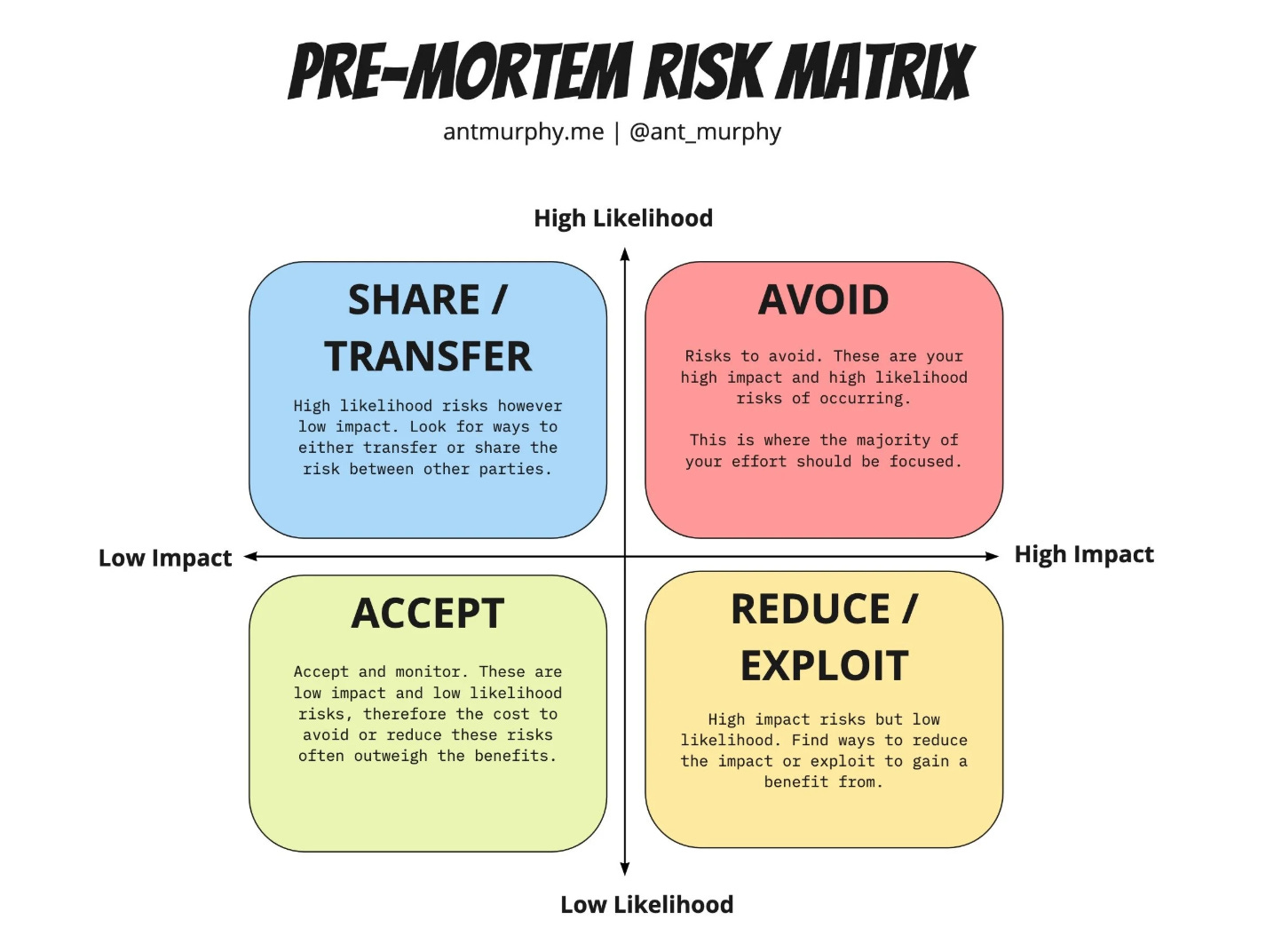 Teachers are brilliant at this part. It flips the mindset from optimism to preparation and surfaces risks early. I then like to use the Risk Matrix from AntMurphy.me to map risks and then move the session towards planning how to reduce the most likely and high impact risks.
